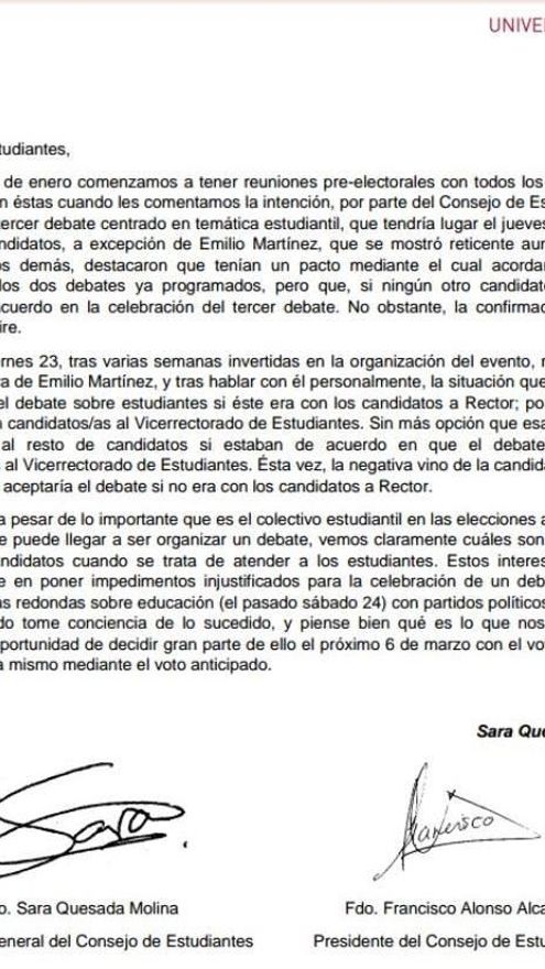 Además, hizo una mención directa a una controversia producida con el Consejo de Estudiantes de la Universidad de Murcia (CEUM). La misma mañana del debate, la secretaria general del órgano estudiantil, Sara Quesada, hacía llegar un correo a la comunidad universitaria en el que señalaba directamente a la candidatura de Emilio Martínez y José Luján como responsables de no haberse cerrado un debate coordinado por el CEUM, que se centraría en el alumnado.