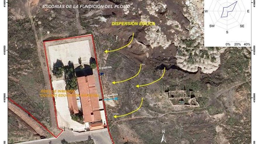 Las principales fuentes de contaminación en ambos centros, según ha sostenido el edafólogo, son tres: en primer lugar, la antigua fundición de plomo 'El Porvenir', constituida por “escorias de fundición” que con el transcurso de los años pueden dar lugar a “sales hidrosolubles enriquecidas con metales pesados que acaban alcanzando las instalaciones educativas”, y que además pueden ser “potencialmente radioactivos”. En segundo lugar, el depósito de residuos 'El Descargador', topográficamente ubicado por encima de los centros, en el que “la acción de la erosión eólica” posibilita que las partículas tóxicas los alcancen. Por último, la rambla que discurre junto a las instalaciones, que “transporta los residuos peligrosos provenientes de 'El Descargador' y cubren su cauce”.