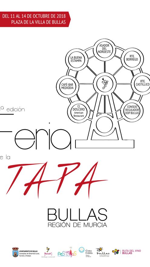 Después de unas exitosas fiestas patronales, los vecinos de Bullas salen de nuevo a la calle para celebrar del 11 al 14 de octubre la edición número quince de la Feria de la Tapa que este año contará con la participación de los restaurantes: Cj Dos Punto Cero, Café Bar Mediodía, La Buena Estampa, Asador del Noroeste, Restaurante Borrego y Restaurante Castillico así como el stand del Consejo Regulador de la DOP Bullas que también estará presente.