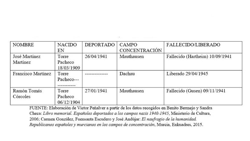 Las víctimas pachequeras de la barbarie nazi, de acuerdo con los datos recogidos por Peñalver, fueron José Martínez Martínez, deportado primero al campo de Mauthausen y después al de Hartheim donde murió en 1941 a los 32 años de edad; Ramón Tomás Córcoles, quien pasó por Mauthausen y falleció en el campo de Gusen en 1941, con 37 años; y Francisco Martínez, que logró sobrevivir en el campo de Dachau hasta su liberación el 29 de abril de 1945.