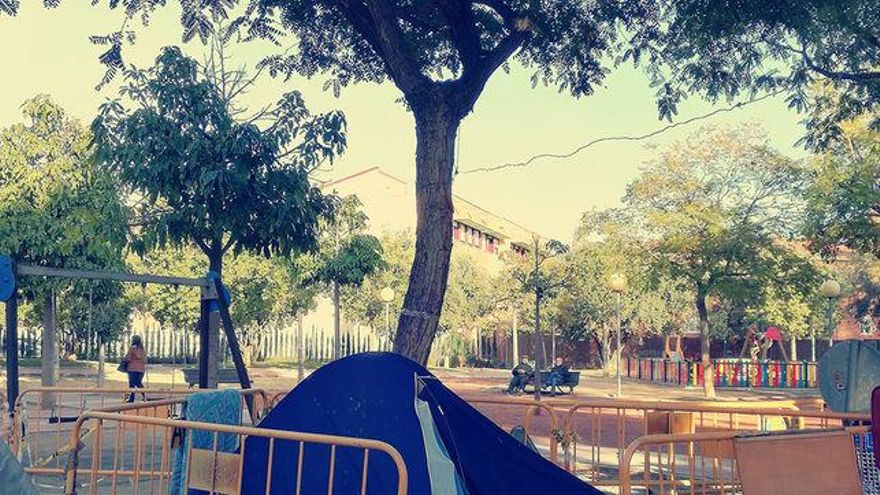 Desde hace 4 meses, entre 25 y 30 vecinos han constituido una concentración pacífica y asamblearia en un parquecillo junto a las vías. Con el propósito de visibilizar la protesta contra el (despropósito del) Ave en Murcia, este grupo acampa con tiendas (cuentan con permisos), utilizando el tiempo de estancia para organizar manifestaciones, debates, actos culturales como mini conciertos desenchufados, charlas sobre política, asambleas abiertas, paellas vecinales o comidas veganas. Entre todos llevan la intendencia (barrer las zonas de paso, fregar cacharros, aportar cables o sofás al sitio) y cuidan del espacio físico de la acampada, así como del parque donde se inserta.