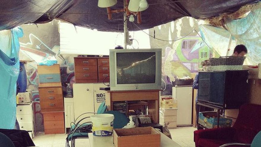 El primer mes, dispusieron unas tiendas de campaña, un frigorífico y una mesa de jardín alrededor de la cual se reunían para organizarse. A día de hoy, 4 meses después, no solo han añadido mantas y sillas a la ocupación, sino que han construido una “sala de estar” con lámparas y sillones, un lavadero, un tendedero, y una mini cocina. No se han conformado con aposentarse, sino que han señalizado el espacio con letreros, han diseñado un sistema de circulación y separación entre tiendas de campaña, zonas de paso y espacios de debate; han techado el “salón” y, por Navidades, han decorado comme il faut los arbolillos del centro.