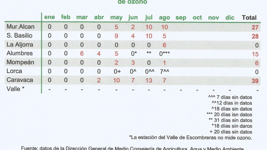 Los datos de este verano muestran la contaminación por ozono en nuestra región en las que las zonas de la aglomeración de Murcia y Caravaca superan ampliamente estos valores. Hay que señalar que las estaciones medidoras de Lorca y Alumbres han estado averiadas durante meses, y es probable que, si hubiesen estado operativas, tendrían más de 25 días de superaciones, el máximo permitidos al año. La magnitud de superaciones en Caravaca tiene que ver con la dinámica atmosférica que lleva la contaminación de ozono del litoral al interior.