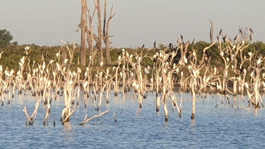 Es como sumergirse enun mundo insólito: cada vez que me pasan los prismáticos descubro los detalles de lo que se alcanza a ver desde la lancha. Cerca del litoral, reluce con una llamarada el plumaje carmesí de dos flamencos avanzando por el barro. Más allá, lo que de lejos parecía una junquera o una empalizada resulta ser un bosque de árboles petrificados, fantasmas que resisten desde 1978 con los pies a remojo en esta laguna salada. Cientos de aves reposan inmóviles sobre las ramas: negros biguás (Phalacrocorax Olivaceus), patos, garzas y garcetas, todo un campamento. Entre palmeras y matorrales, cada vez más misteriosa, nos recibe una antigua torre de agua. El olor a algas podridas inunda esta zona.