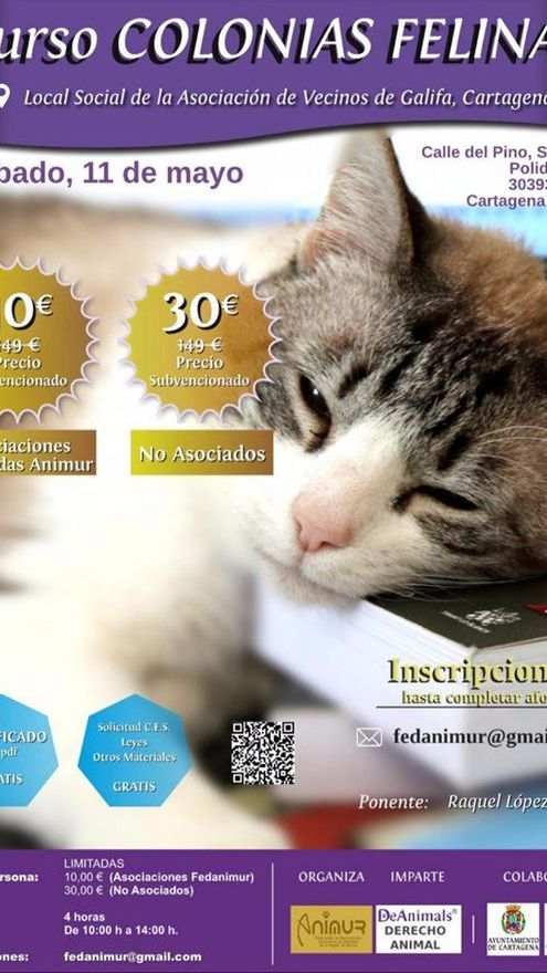 Hoy te quiero invitar a un curso de Colonias Felinas pionero en la Región de Murcia, organizado por la Federación de Protectoras de Cartagena llamada ANIMUR que cuenta con la colaboración del Ayuntamiento de Cartagena y de la Asociación de Vecinos de Galifa y yo soy la ponente.