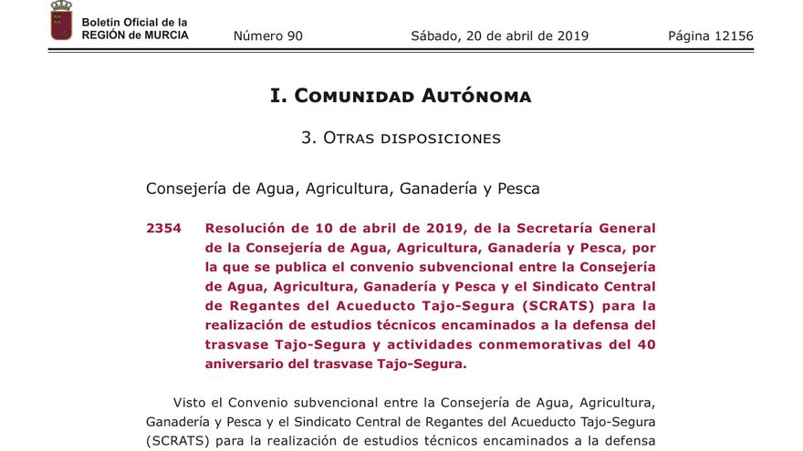 El pasado 31 de marzo el trasvase Tajo-Segura cumplía 40 años y el Gobierno de Murcia lo celebró ampliamente. La Consejería de Agua, Agricultura, Ganadería y Pesca de la Región de Murcia otorgó al Sindicato Central de Regantes del Acueducto Tajo-Segura (SCRATS) una subvención por valor de 100.000 euros para realizar “estudios técnicos encaminados a la defensa del trasvase Tajo-Segura y actividades conmemorativas del 40 aniversario del trasvase”, según publicó el BORM el pasado sábado.