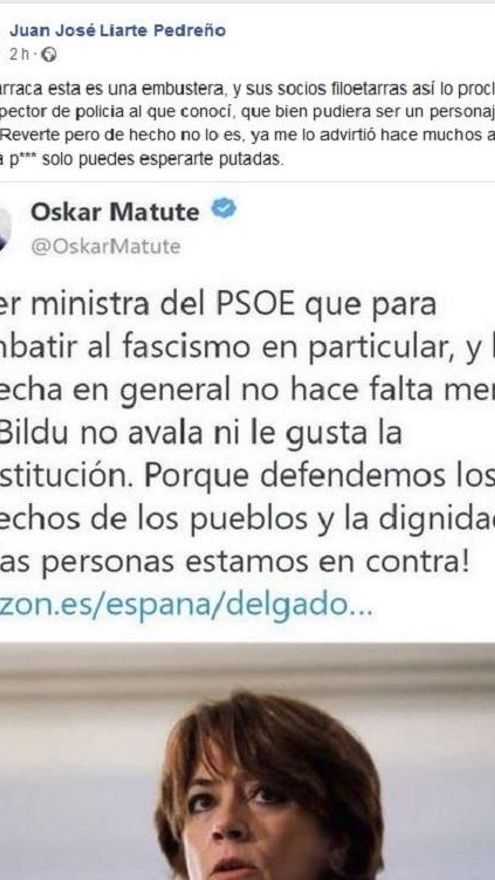 Juan José Liarte Pedreño, portavoz de Vox en la Asamblea Regional de Murcia, publicó en su cuenta personal de Facebook insultos que hacían referencia a la Ministra de Justicia en funciones, Dolores Delgado, y a la agrupación política EH Bildu. Liarte calificó de “tiparraca” y “embustera” a la dirigente socialista, como respuesta a las declaraciones de la ministra recogidas por La Razón, en las que señalaba que “PDcAT, Bildu y ERC han aceptado la Constitución pero Vox la rechaza en parte”. El mensaje del portavoz de la agrupación de extrema derecha, que ya eliminó, finaliza señalando que de “una p*** solo puedes esperarte putadas”.