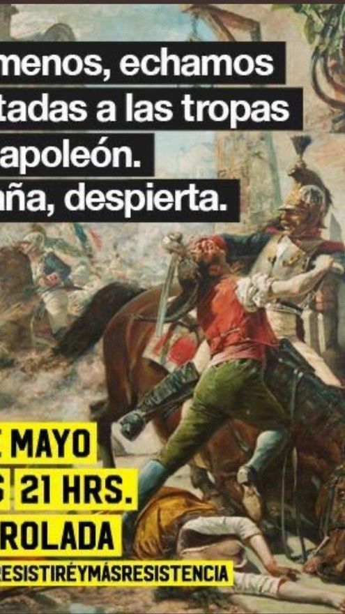 Vox utilizó el aniversario del levantamiento del 2 de mayo de 1808 ocurrido en Madrid tras el motín de Aranjuez, cuya represión por parte de las fuerzas napoleónicas llevaría llevaría a la guerra de la independencia española para hacer un paralelismo con el fin del actual Gobierno.