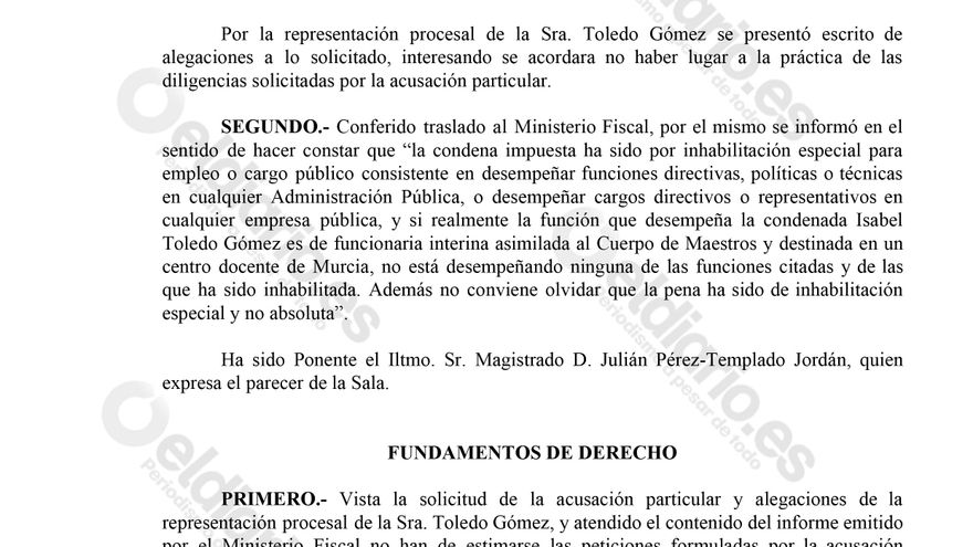 Mientras que en el primer auto dictado por el mismo TSJM en mayo de 2016 se señalaba que “y si realmente la función que desempeña la condenada Isabel Toledo Gómez es de funcionaria interina asimilada al Cuerpo de Maestros y destinada en un centro docente de Murcia, no está desempeñando ninguna de las funciones citadas y de las que ha sido inhabilitada”.