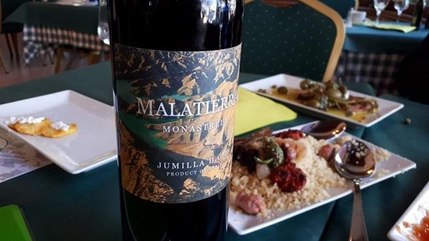 Ya estamos tocando el final de la jornada, y en El Mirador nos espera Bernardo, un enamorado de su tierra, y que lo intenta mostrar a base de recetas antiguas y tan simples como buenas. Sus patatas con ajo ‘las nuestras’, son una delicia, no ha variado un ápice de la receta de su madre, la Sra. Juana, igual que sus migas de harina, obra de su padre, reconozco que hacía tiempo no probaba unas migas tan exquisitas como suaves. Nos trae un vino de Jumilla bajo el nombre Malatierra, cuya etiqueta es el embalse que duerme cada noche en este paisaje lunar que vamos a ver.