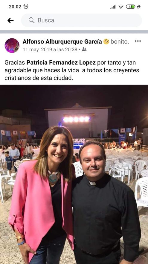 “Es tiempo de una fuerte crítica hacia aquellos que nos gobiernan desde un desgobierno central y que están creando una gran paranoia nacional”, abundó el cura, quien asiste con asiduidad a los mítines del PP en la localidad murciana y ha publicado en su cuenta de Facebook imágenes felicitando a la alcaldesa popular Patricia Fernández.