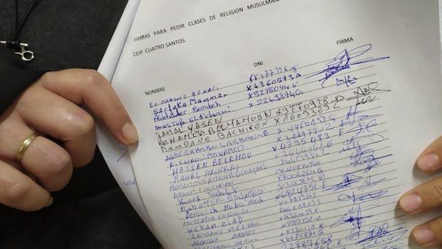Ikram, que llegó a Cartagena de la localidad marroquí de Oujda hace 17 años, muestra el documento con las firmas de sus 300 vecinos –“son de españoles y marroquíes, algunos padres del cole y otros no”- que apoyan que se imparta islam en el CEIP Cuatro Santos de Cartagena, donde estudian sus hijos. “El curso pasado, en abril, hicimos la demanda a la Consejería de Educación y no hubo respuesta; a ver si esta vez tenemos más suerte”.