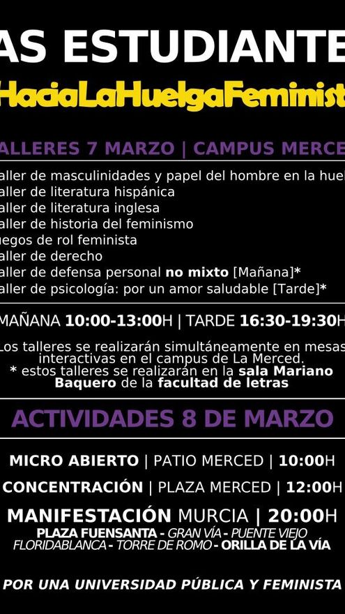 Una agrupación de más de 50 estudiantes de diferentes carreras se ha unido para organizar una serie de talleres, abiertos a todo el público (universitario o no), de cara a la Huelga Feminista del 8 de marzo. Serán el miércoles 7 en el patio de La Merced de 10:00 a 13:00 y de 16:30 a 19:30.