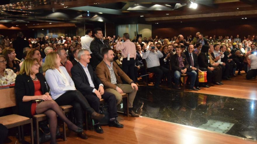 Después de la charla de Hazte Oír ha comenzado el mitin de Vox, como parte de su gira que recorre el país denominada “La España Viva”. El acto se ha celebrado en una sala distinta del mismo hotel con capacidad para 1500 personas. El líder de la formación, Santiago Abascal, ha agradecido a los asistentes su presencia multitudinaria y ha pedido la dimisión del candidato del PSRM-PSOE y también delegado del Gobierno, Diego Conesa, por “los matones de la puerta”, en clara referencia a los manifestantes.