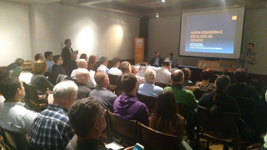 El salón del Hotel Nelva, con capacidad para 130 personas, se ha llenado con público de todas las edades. A la entrada de la charla, donde se han vertido críticas al feminismo y al movimiento LGTBI, un joven ha declarado a este periódico que “Vox es el partido que necesita España ahora mismo y junto con Hazte Oír defienden los valores de la familia”.