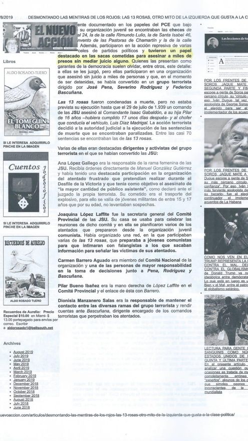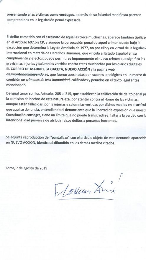 Dimas, que también colabora con diferentes asociaciones de memoria histórica y es delegado regional de la Asociación AGE (Archivo, Guerra y Exilio), ha localizado un texto que ha sido publicado en 'El Correo de Madrid', 'La Gaceta', 'Nuevo Acción' y la web desmontandolaleyenda.es en el que aparecen “gravísimas injurias y calumnias vertidas contra estas muchachas que fueron asesinadas por razones ideológicas en un marco de crímenes de lesa humanidad”, reza el escrito de denuncia, al mismo tiempo que adjunta los enlaces e imágenes del artículo que ha sido replicado por los citados medios de comunicación.