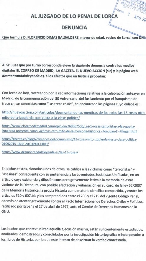 El investigador murciano Floren Dimas ha interpuesto una denuncia en el juzgado de lo penal de Lorca contra tres medios de comunicación ultras y una página web que calificaron a 'Las 13 rosas' como “terroristas” y “asesinas”. La denuncia, con fecha de 7 de agosto, ha sido depositada dos días después de la conmemoración del 80 aniversario del fusilamiento de estas mujeres a manos de la dictadura franquista.
