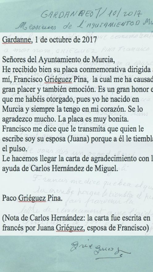 El murciano Francisco Griéguez ha agradecido por carta el reconocimiento realizado desde Murcia por su condición de víctima en los campos de concentración nazi. Lo ha hecho a través de Víctor Peñalver, el historiador ceheginero que comenzó una campaña de reconocimiento para todas las víctimas de la Región que, como Griéguez, hubiesen padecido en los campos de muerte de Hitler.
