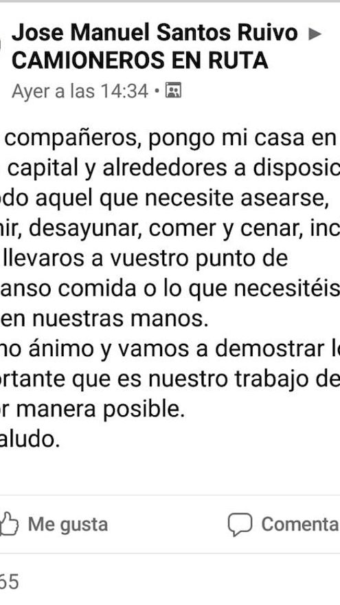 El administrador en Facebook del grupo Camioneros en Ruta, se muestra conmovido ante las muestras de solidaridad: “Se han cerrado restaurantes y servicios también en carretera, por lo que carecen de lugares donde hacer las necesidades básicas, el aseo personal y algo tan necesario como lo es comer”. Pero insiste en que “hay una gran conciencia en todos los camioneros de que ahora hay que abastecer, más que nunca, para que al pueblo en general, no le falte de nada”.