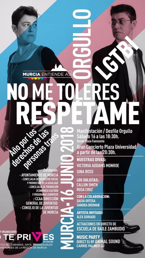 El Sábado 16 de Junio se producirá la manifestación 'Orgullo LGTBI de Murcia 2018' que saldrá a las 18:30 y estará presidida por una pancarta que integrará el lema 'Contra la transfobia social, más educación en diversidad afectivo sexual'
