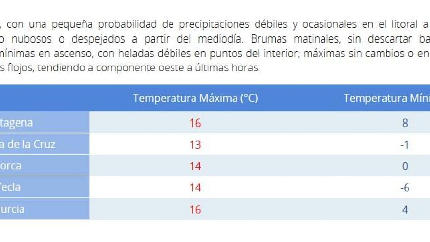 A partir del viernes, la Región de Murcia alcanzará las mínimas de -1ºC y los -2ºC este sábado , según informa la Agencia Estatal de Meteorología (AEMET). Las máximas de la Comunidad no sobrepasarán los 20ºC en la ciudad de Murcia y los 16ºC en Caravaca de la Cruz.