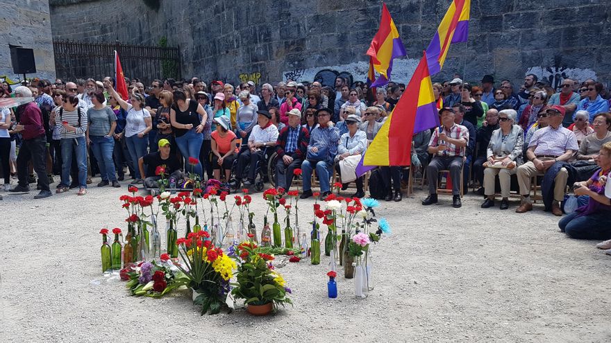 Un sol radiante ilumina la entrada del fuerte, donde se han congregado cientos de personas con banderas republicanas. Un círculo de 14 botellas y 14 claveles rojos recuerda a los fusilados por ser considerados instigadores directos de la fuga. Desde hace 30 años, la asociación Txinparta se encarga de recordar los hechos.