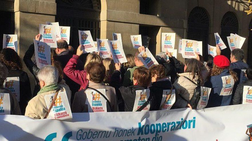 La Coordinadora ha aprovechado la comparecencia ante los medios para presentar su campaña #LesDanLaEspalda, que denuncia en redes sociales (aunque los participantes en la concentración portaban también folios impresos con el lema) que las instituciones navarras les dan la espalda a personas a las que se les vulneran sus derechos más elementales.
