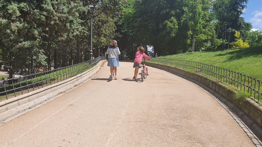 En la parte baja del parque hay tres trozos del Muro de Berlín que nos regaló la ciudad alemana en 1990. Los rodea un estanque de poca profundidad que es vaciado de vez en cuando. En este momento está seco y los niños y las niñas traspasan la mínima barrera, como alemanes del Este derribando el muro, y así conquistan el otro lado, hasta entonces prohibido. Meten incluso las bicicletas y los patinetes. No hablará bien de mí, pero en ese momento yo estaba preocupada por los trozos de muro pintados con sus grafitis originales (el exalcalde José María Álvarez del Manzano contó en una ocasión que los servicios de limpieza del Ayuntamiento estuvieron a punto de borrarlos, pero esa es otra historia). “En realidad es un monumento, quizá no deberían estar allí”, le dije a la madre de una de la niñas que, como la mía, habían hecho esta invasión de pista. Pero no se me ocurrió sacarla.