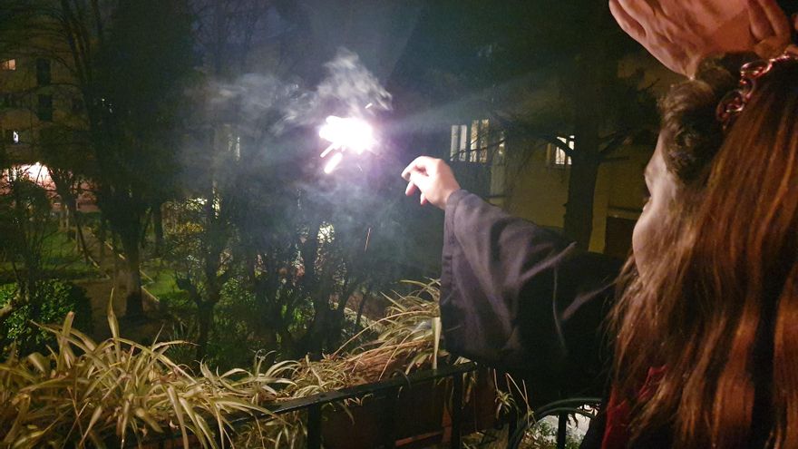 Nuestro contacto más directo con la humanidad sucede a las ocho de la tarde, cuando salimos a aplaudir al balcón y nos encontramos con voces, gritos y palmadas de nuestras vecinas y vecinos. Hemos llegado a sacar también sartenes y bengalas, como para estar un poco más cerca. He visto unas manos que asomaban entre unas rejas. He oído vuvuzelas o bocinas de gas. He oído aplausos que se arrancan con ritmo cuando otros más cansados se apagan. He visto a una mujer paseando un perro y alzando las manos, sonriendo con la boca muy abierta, repentinamente muy feliz.