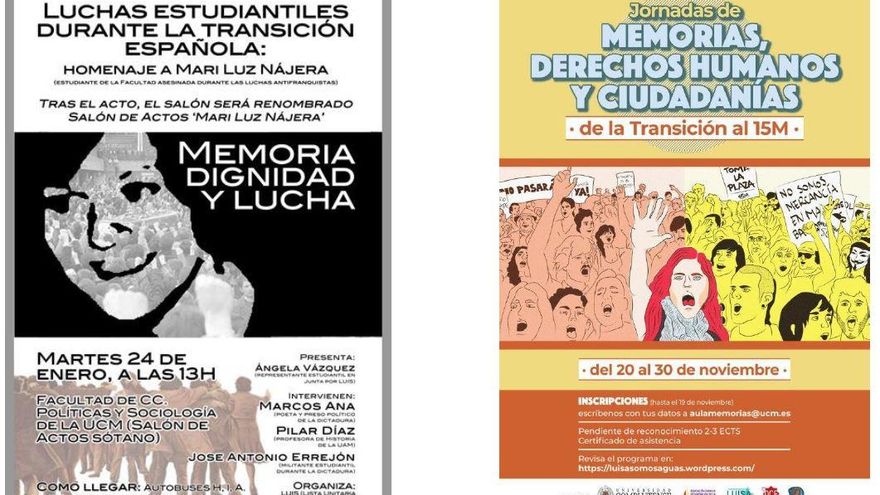 En 2012, el movimiento estudiantil de mi facultad consiguió renombrar el Salón de Actos con su nombre, realizando un necesario* homenaje a una persona que la universidad mantuvo 35 años en el olvido. Este pasado mes de noviembre, casi siete años después, el mismo Salón Mari Luz Nájera acogió las Jornadas de Memorias, Derechos Humanos y Ciudadanías. De la Transición al 15M en las que estudiantes, profesores y personas de la sociedad civil compartimos reflexiones sobre el pasado traumático de nuestro país y el silencio que se impuso a cerca del mismo. Su nombre sobrevoló todas las jornadas, que fueron también un homenaje a mucha otra gente, como Nicolás Sánchez Albornoz, cuyo compromiso social no nos podemos permitir olvidar porque nos ilumina el presente.