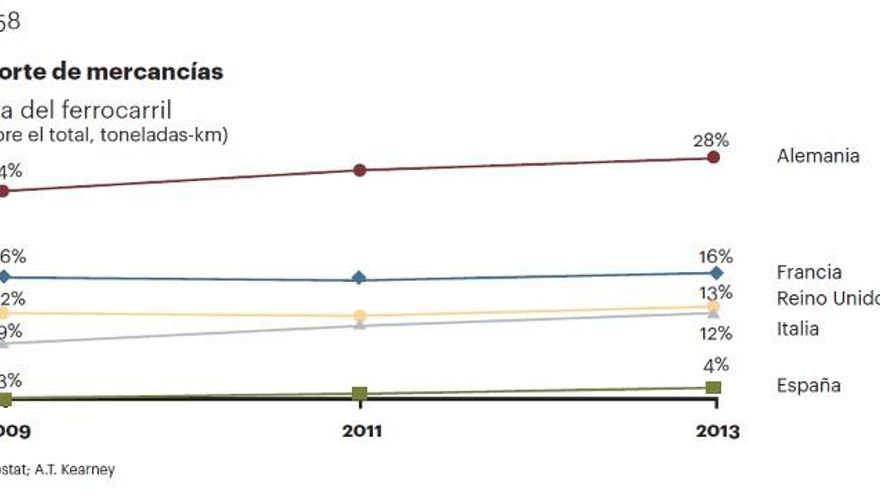 Y aún más lejos de los estándares internacionales se encuentra la insólita desconexión del puerto de Algeciras (uno de los más importantes del mundo) del ferrocarril de mercancías.