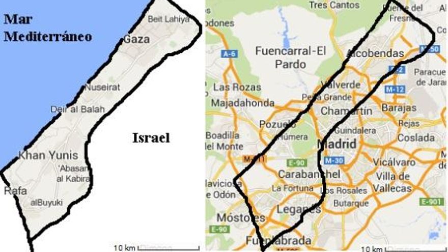 El tamaño de la Franja de Gaza equivale a la superficie de Alcobendas, San Sebastián de los Reyes, los distritos madrileños de Chamartín, Fuencarral sin El Pardo, Moncloa-Aravaca, la Casa de Campo, Carabanchel y Latina, más La Fortuna, Alcorcón, Leganés y Fuenlabrada. Menos de la mitad de Madrid y un puñado de sus localidades vecinas. Muy poco espacio, para una de las zonas con mayor densidad de población del mundo y por supuesto, sin continuidad territorial con el resto del país (Cisjordania). De hecho, para viajar de Gaza a Cisjordania, lo habitual es ir en coche hasta El Cairo (367 kilómetros, como Madrid a Zaragoza), coger un avión de El Cairo (Egipto) a Amán (Jordania), y después en coche de Amán a Ramala (75 kilómetros, como de Madrid a Toledo) y que en cada uno de los pasos de frontera, los soldados israelíes no te pongan muchas pegas. En realidad, si no hubiera fronteras, por carretera, de Gaza a Ramala, hay tan sólo 100 kilómetros. Poco más de una hora en coche por nacional.