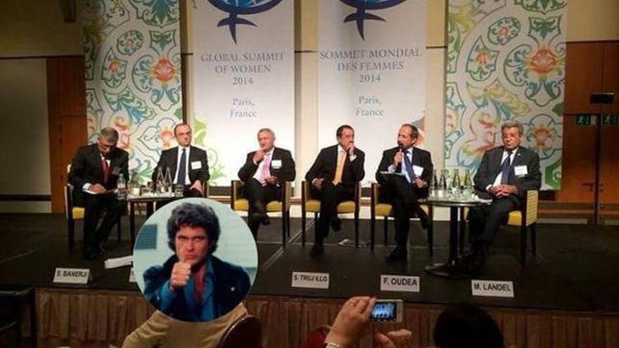 Leyendo el comunicado completo, más bien parece que Podemos se ha marcado un “All Male Panel”, un blog coordinado por Saara Särma, investigadora en Relaciones Internacionales por la Universidad de Tampere en Finlandia, que lleva varios años recopilando imágenes de paneles académicos, eventos o cualquier clase de cita de carácter público donde solo se ha previsto que hablen hombres del tema en cuestión. En la página se documentan imágenes de estos eventos y en cada una de ellas aparecía David Hasselhoff con un pulgar arriba y en señal de aprobación para esos hombres.