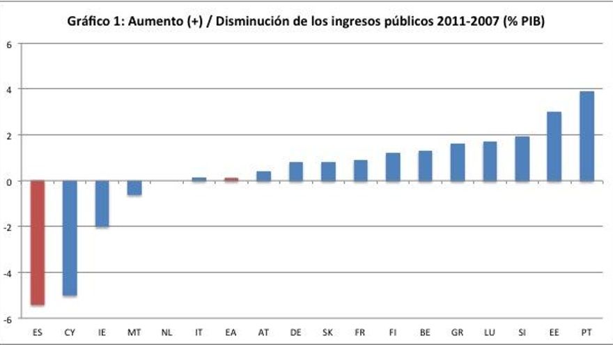 –Los ingresos públicos se desplomaron con el pinchazo inmobiliario reduciéndose en 5,4 puntos de PIB (pasando del 41,1 puntos PIB en 2007 al 35,7% puntos de PIB en 2011). Como se puede ver en el gráfico 1, esto no ha ocurrido en ningún otro país de la zona euro y nos ha dejado con una de las presiones fiscales mas bajas de Europa. Por este motivo, podemos afirmar que la crisis fiscal en España es una crisis de ingresos, tal como expuse en un artículo previo.