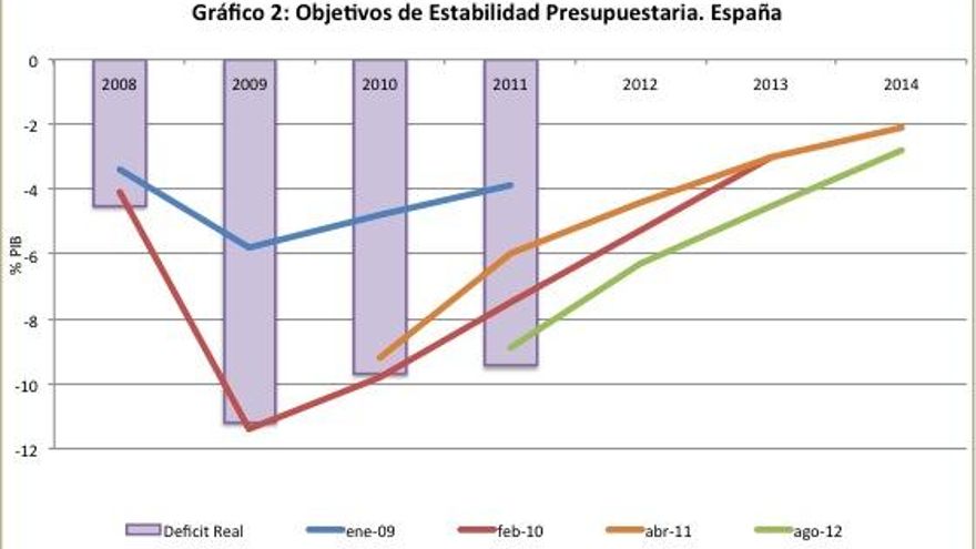 –España se ha caracterizado, en estos últimos años, por incumplir sistemáticamente sus objetivos de déficit. En primer lugar, la Unión Europea fija unos objetivos de déficit ambiciosos. El Gobierno, a su vez, se compromete en que los cumplirá. Pero conforme pasa el tiempo, el Gobierno se da cuenta de que las medidas de ajustes puestas en práctica no van a generar los resultados esperados, por lo que, ante un posible incumplimiento, la UE relaja los objetivos iniciales. Aún así, España incumple nuevamente los nuevos objetivos (véase el gráfico 2).