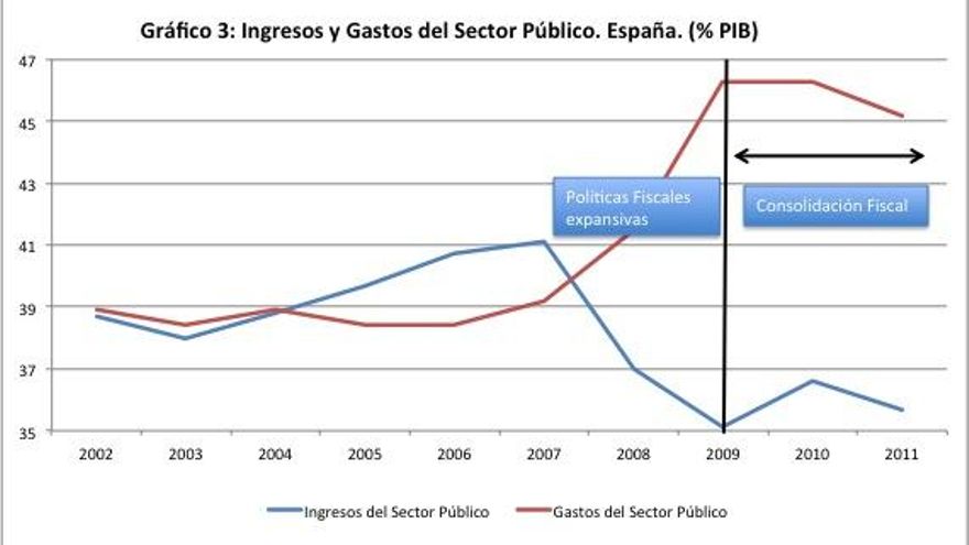 –En el año 2009, España alcanzó el máximo nivel de gasto público: el 46,3% PIB, como consecuencia de las políticas de estímulo del gasto introducidas en la fase expansiva (muchas de estas medidas eran temporales como el Plan-E).
