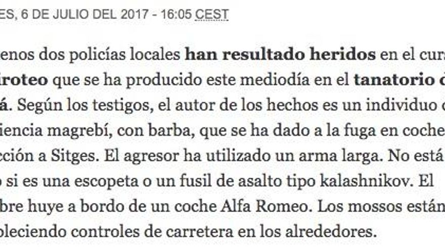 Con pocos detalles disponibles sobre el ataque, El Periódico de Catalunya publicaba la siguiente información, borrada poco después, en la que recogía una descripción del tirador cargada de subjetividad: “Según los testigos, es un individuo de apariencia magrebí, con barba”.