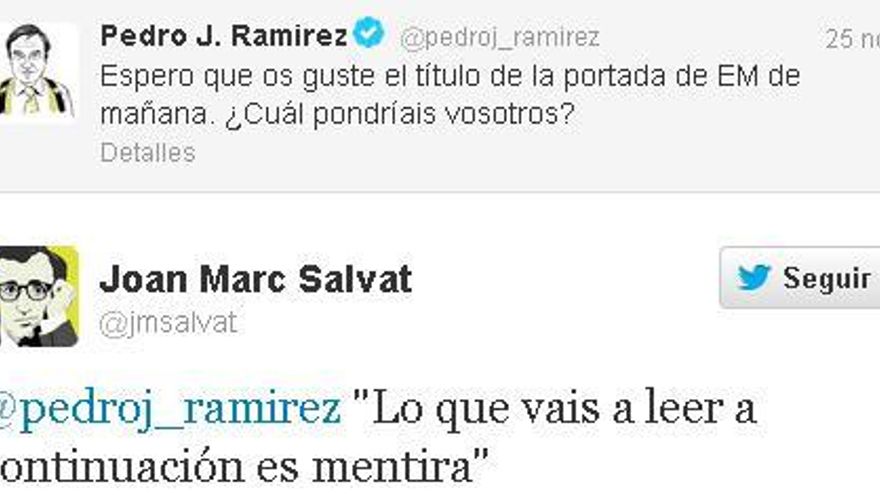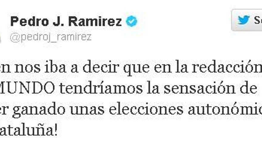 Pero no era eso. Al final resultó que se sentía ganador porque achacó el patinazo de Mas a los dudosos borradores de El Mundo (cuya difusión en Cataluña, por cierto, es de menos de 20.000 ejemplares). Pedro J. creía haber influido en el voto catalán de tal manera que había conseguido arrebatarle los doce diputados a CiU y le había privado de la mayoría absoluta.