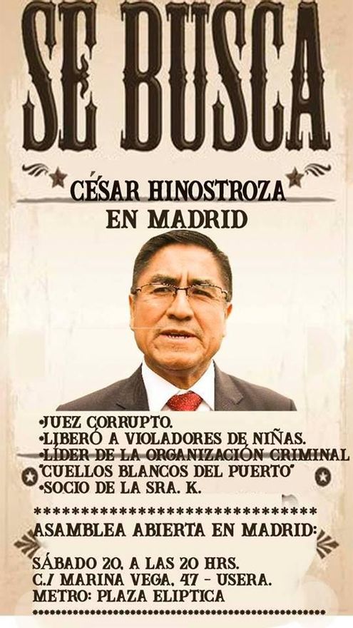 Puede que aún no estén al tanto pero desde el miércoles tienen refugiado en su territorio –en la ciudad de Madrid, para ser exactos– al hombre más buscado del Perú. Se trata del exjuez supremo César Hinostroza Pariachi, quien se encuentra prófugo de la justicia peruana. Se le busca por ser un funcionario que ha incurrido en varios actos de corrupción, por ser líder de la organización criminal los Cuellos blancos del Puerto –una banda que operaba dentro y fuera de la Corte Superior de Justicia del Callao y a la que se le imputan los delitos de corrupción de funcionarios, tráfico de influencias, cohecho y peculado. También se le busca por haberse reunido con “la señora K”, nombre en clave para Keiko Fujimori, líder del fujimorismo, que tiene mayoría en el Congreso, y por actuar como su socio dentro de los juzgados en los diversos casos abiertos que tiene ella misma y miembros de su partido. Por estas razones ha sido ya ha sido destituido e inhabilitado por diez años.