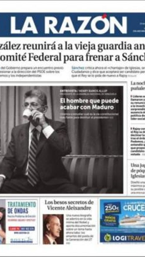 24 de enero de 2016.La Razón avanza en portada que Felipe González va a tomar las riendas: “Reunirá a la vieja guardia antes del Comité Federal para frenar a Sánchez”. La ejecutiva también le niega el pan progresista como declaró José Antonio Pérez Tapias. El País atiza fuerte. Llegará a llamar a Sánchez en editorial de portada “insensato sin escrúpulos”. Su demoscopia sigue ensalzando a Rivera, el líder político mejor valorado. No como “otros”. En ese contexto echan las culpas a Iglesias y Podemos de no haber votado a Sánchez.