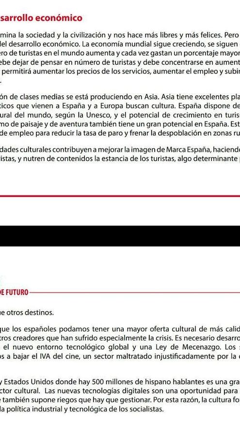 Pedro Sánchez desarrolla, con mucha mayor amplitud (dos páginas), sus propuestas culturales. Alguien se tomó la molestia en el equipo de hacer un programa. El concepto básico plantea “la cultura, como eje del país, derecho fundamental y motor de desarrollo”. Para el candidato, “la educación es la clave del futuro”. Propugna extender las becas y bajar las tasas universitarias.