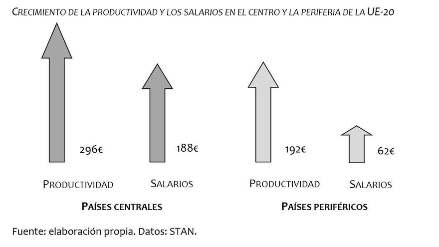 A partir de lo anterior, extraemos dos ideas fundamentales. Por un lado, se constata que hay un distanciamiento entre los países centrales y periféricos de la UE-20 durante las últimas décadas. Dicha divergencia es más acentuada en lo que se refiere a los salarios que a la productividad. Tal y como se ha podido ver, esto no significa que la periferia europea no haya conseguido mejoras de la productividad o de los salarios sino que dicho crecimiento es significativamente inferior a los de los países centrales, quienes además partían de niveles superiores. Esa es la justificación del distanciamiento entre ambos bloques de países.