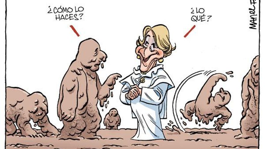 La Esperanza (Aguirre) es la última que se pierde. Se han perdido todos sus amigos, desde Granados a Lamela pasando por Güemes y López Viejo, y ahora Ignacio González, todos aquellos a los que nombró y puso al frente han caído, pero ella siempre ha encontrado la manera de caer de pie y salir del lío. Durante su mandato han ocurrido los casos de corrupción más graves, Gürtel, Púnica, Caja Madrid, pero de nuevo se las ingenió para que no le salpicasen. Tiene la habilidad de pudrir todo lo que toca y seguir como una rosa, de dejar que el barro de la corrupción campe a sus anchas y quedarse tan ancha. Debe de tener un cuadro de Esperanza Grey en casa. Nadie lo ha expresado mejor que Manel Fontdevila en esta viñeta en la que muestra a la presidenta impoluta, con un traje blanco de angélica inocencia, en mitad de un barrizal que lo enfanga todo.