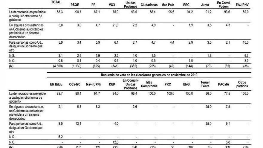 El 85% de los encuestados por el CIS consideran que “la democracia es preferible a cualquier otra forma de gobierno”, frente al 5% que optaría por un gobierno autoritario en determinadas circunstancias. El desglose es curioso. El 21% de Vox, 750.000 de sus más de 3.600.000 votantes; el resto, al parecer, no es consciente del ideario de su partido. Hay un rescoldo por todo el espectro político.