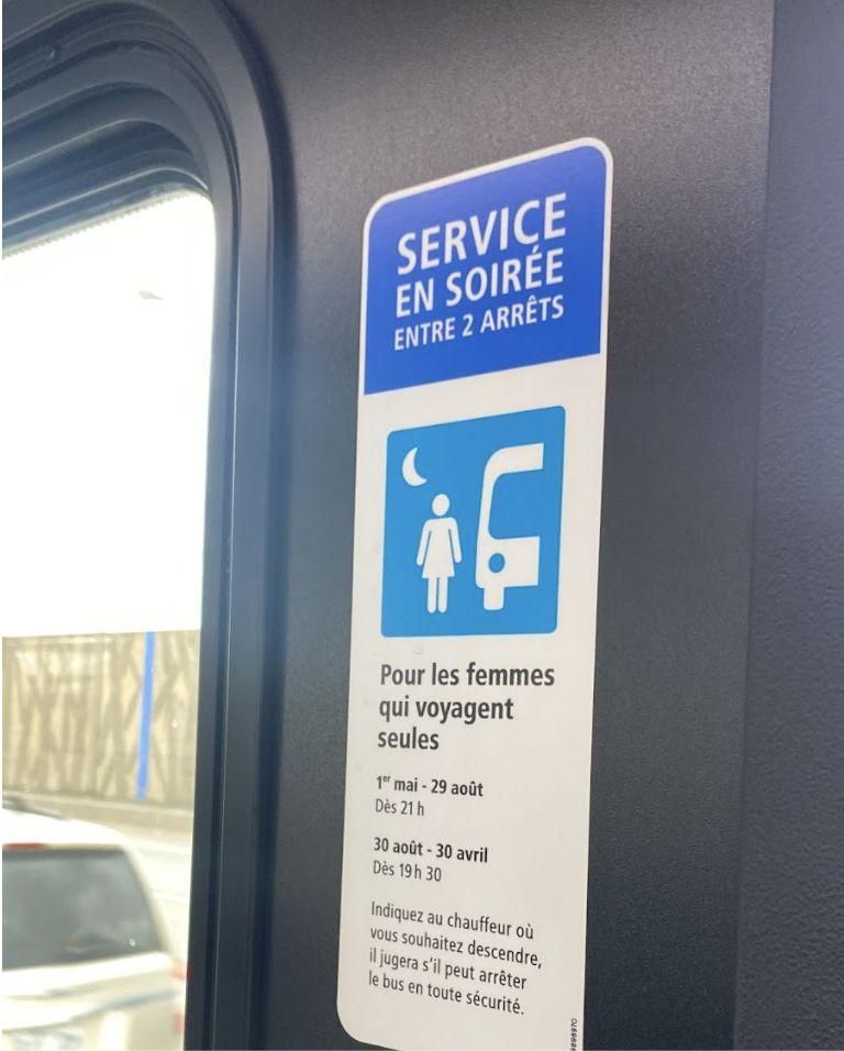 Para quién no hable francés, esta señal informa de un servicio para mujeres que viajan solas por la noche, concretamente, parada entre paradas. Informas al conductor, y hace la parada extra para que llegues más segura a casa. Se ofrece desde el 2004. En España también vamos con un poco más de retraso, pero se empieza a ofrecer también. Ciudades como San Sebastián, Bilbao, Valencia, Alicante hacen estas paradas extra, lo llaman paradas rosas o paradas violetas.