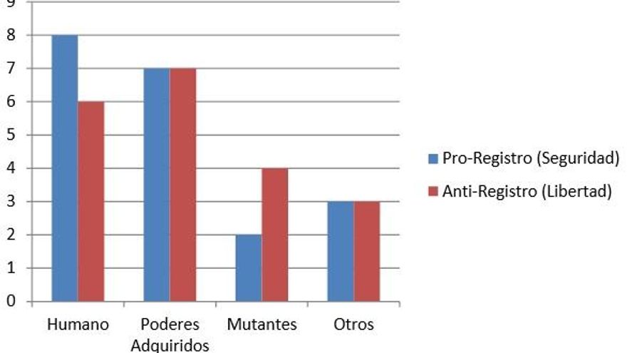 De acuerdo al origen los superhéroes de Marvel (Fig.1) se pueden catalogar en cuatro categorías: los humanos sin poderes (como Iron Man), los que tienen poderes adquiridos durante su vida (como Spiderman o Los 4 Fantásticos), los mutantes con poderes desde su nacimiento (Los X-Men) y los otros (dioses como Thor o alienígenas como Venom). Aunque estén muy igualados, generalmente son más miedosos y pro-seguridad (a costa de derechos individuales) aquellos que no tienen poderes, frente a los que los tienen de nacimiento y lo que buscan es el anonimato.