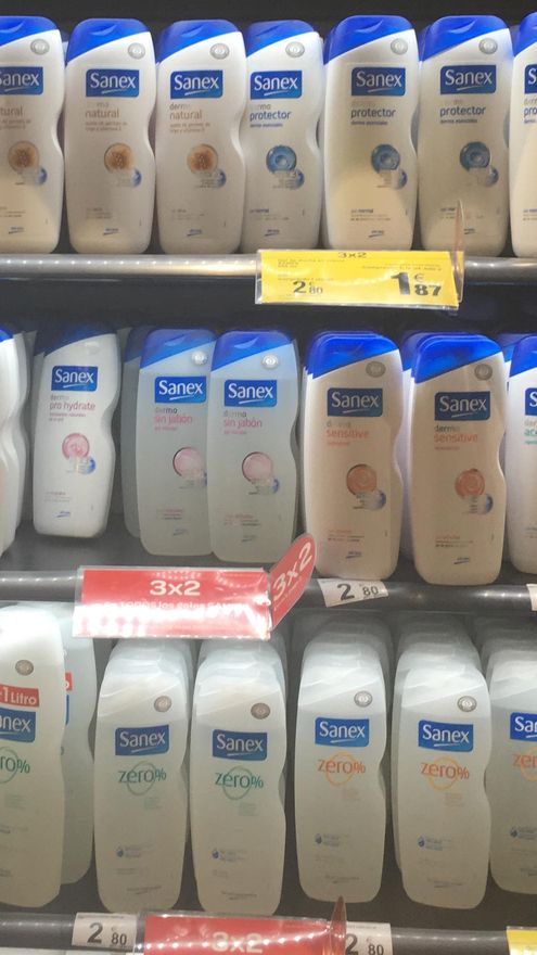 Aquí vemos tooodo el catálogo de diferentes geles para “no hombres”: pieles secas, pieles irritadas, pieles sensibles y pieles con cosas en las que un verdadero hombre no tiene tiempo de fijarse. Más barato con más cantidad.
