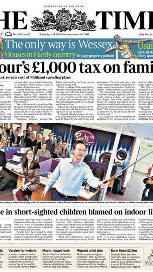 The Times, un periódico con casi dos siglos y medio de historia, el primero en disponer de corresponsales y enviar periodistas a conflictos armados, acaba de publicar a toda portada un titular tendencioso a sabiendas. Invadiendo la campaña electoral en curso. Lo descubrió nuestro compañero Iker Armentia. No era cierto que los laboristas fueran a cargar con 1.000 libras anuales a las familias, como figuraba a 5 columnas. La propuesta de Miliband es añadir este impuesto a quienes tengan propiedades por un valor superior a dos millones de libras, sueldos elevados, y a grandes empresas, entre ellas las tabaqueras. En la “aclaración” -no con la relevancia del primer titular- se argumenta que el dato de a quiénes afectaba, se incluía al final del artículo. Luego fue absolutamente deliberado. “Algunos de estos impuestos y gravámenes sólo se aplicarán a las empresas, y los demás solo afectarán a una pequeña minoría de las familias, no a ”cada familia trabajadora“ como se informó”, precisaron. Y punto. Pero es lo que queda. Igual que esas portadas como puñales que se lanzan en España. The Times pertenece hoy a Murdoch.