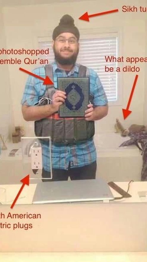 Los añadidos en photoshop son bien evidentes. Le cambian el iPad por un Corán. Le colocan un chaleco… bomba, se supone. Incluso agregan un consolador -un pene- en el alfeizar de la ventana. Pero el torpe manejo deja ver errores: el turbante sij o el espejo que refleja el enchufe canadiense.
