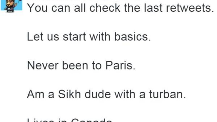 La foto del montaje comienza a circular por Internet. La víctima lo denuncia: vive en Canadá, es Sij, no árabe musulmán; ni siquiera ha estado jamás en París.
